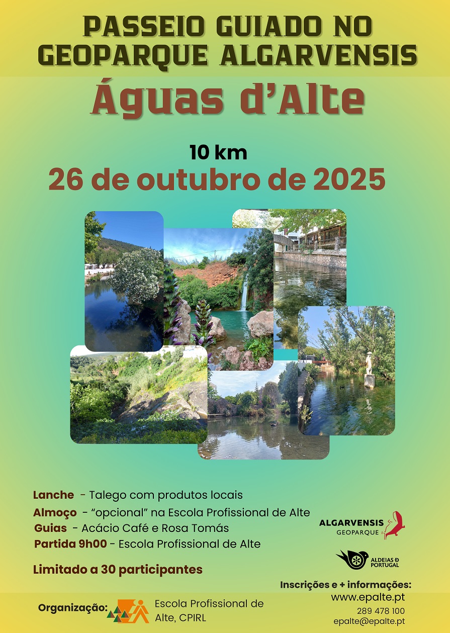 No próximo dia 26 de outubro, a Escola Profissional de Alte promove o Passeio Pedestre Águas d'Alte, uma iniciativa que celebra um marco histórico: a aceitação oficial da candidatura do Geoparque Algarvensis Loulé-Silves-Albufeira à Rede Mundial de Geoparques da UNESCO.