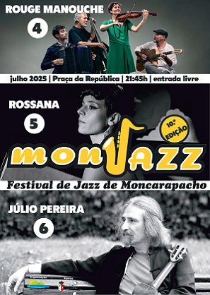 A abertura do Monjazz será feita pelo quarteto Rouge Manouche, constituído por músicos residentes no Algarve e que vão levar a palco o jazz puro dos anos 30 e 40 do século passado. No sábado, dia 5, sobe ao palco a irreverente Rossana, de seu nome Inês Barroso, cantora portuguesa radicada em Londres. Versátil, a sua música prima pela diferenciação, explorando géneros que vão do jazz ao psy-rock, passando pela música latina, folclórica portuguesa e eletrónica. O 10.º MonJazz encerra no domingo, dia 6, com um dos instrumentalistas mais sonantes do nosso país: Júlio Pereira, o ‘rei’ do cavaquinho e que no festival vai apresentar o seu último trabalho (CD-Livro) “Rasgar” e revisitar algumas das suas músicas emblemáticas.