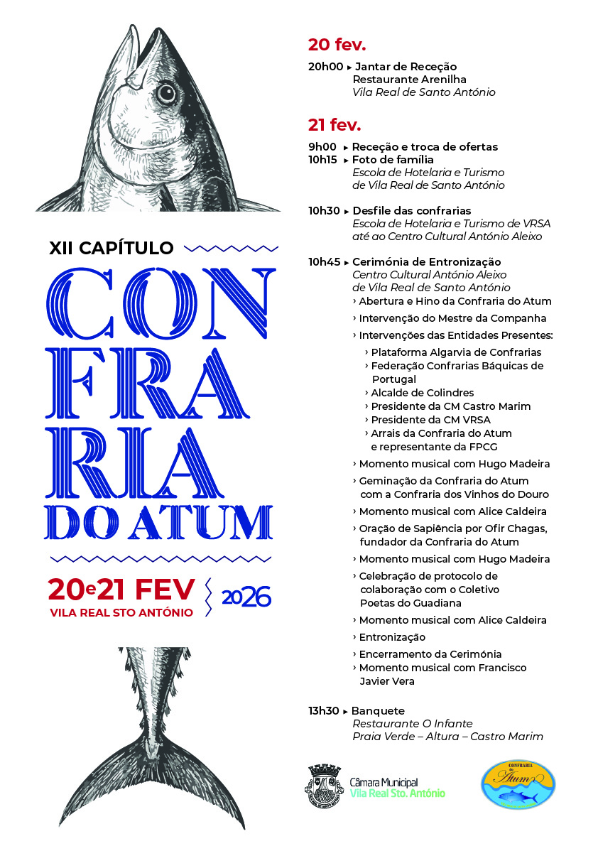 A Confraria do Atum de Vila Real de Santo António realiza, no dia 21 de fevereiro, o seu XII Capítulo, e vai organizar uma cerimónia no Centro Cultural António Aleixo.