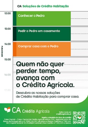 Com o mote “Quem não quer perder tempo, avança com o Crédito Agrícola”, a campanha reforça as condições competitivas do Crédito Habitação no Crédito Agrícola.