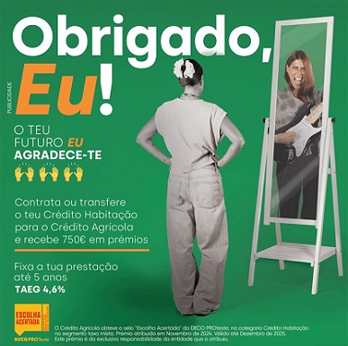 O Crédito Agrícola acaba de lançar a iniciativa "Obrigado, Eu!", direcionada a jovens entre os 18 e os 35 anos que pretendem contratar ou transferir o seu Crédito Habitação para o Crédito Agrícola, com o objetivo de os capacitar nesta nova fase da vida e os ajudar a concretizar o sonho de comprar finalmente a sua própria casa.