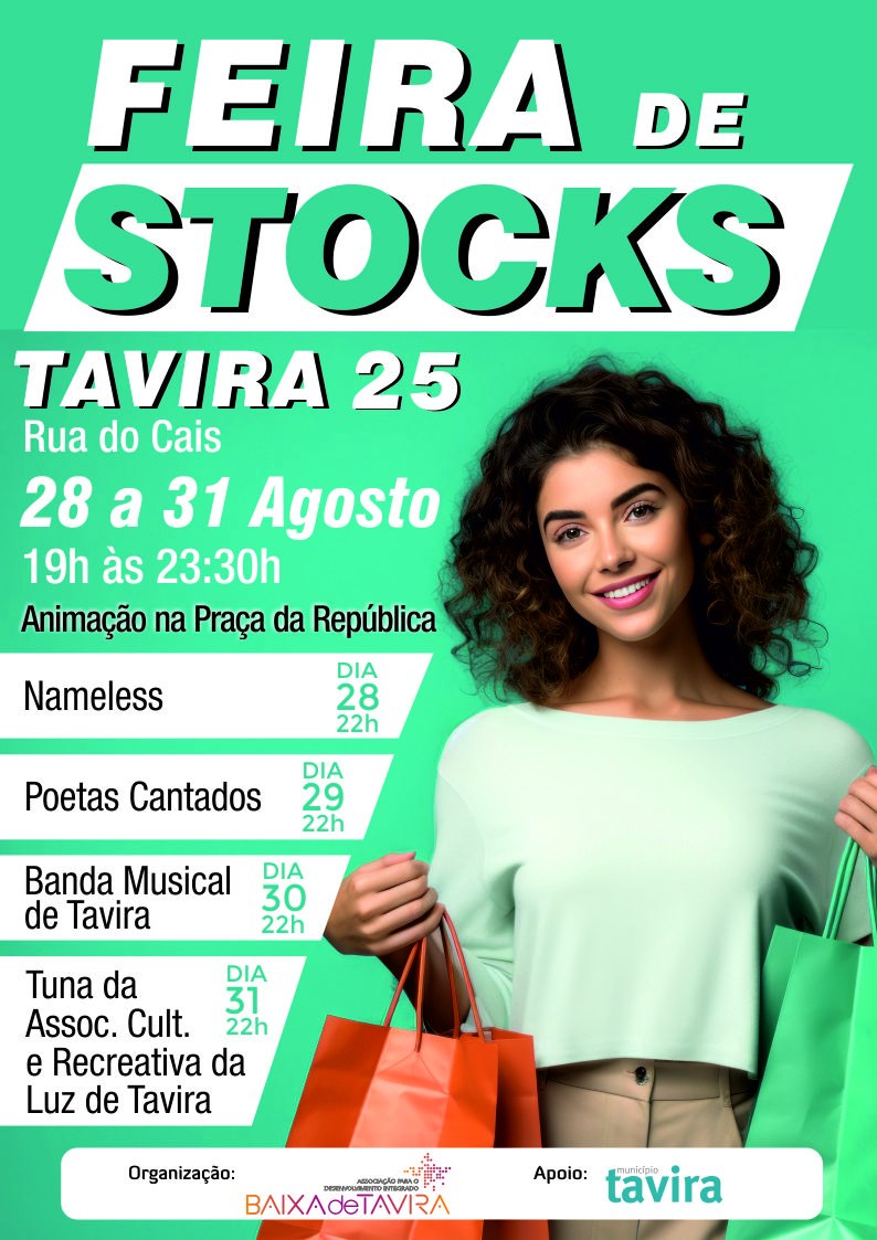 A Associação Baixa de Tavira, com o apoio do Município de Tavira, realiza, de 28 a 31 agosto, a 15.ª edição da Feira de Stocks, na Rua do Cais, entre as 19H00 e as 23H30, com entrada livre.