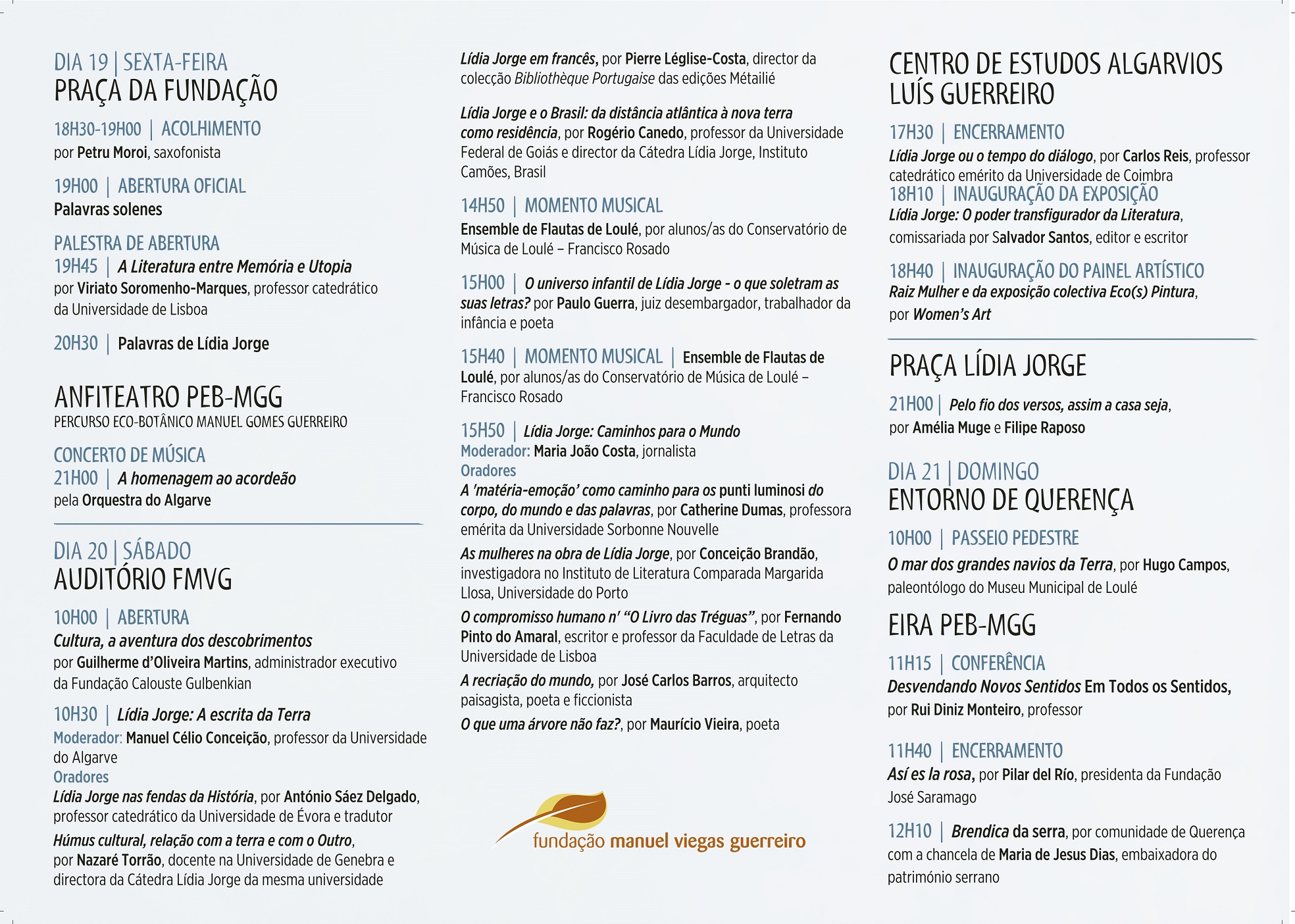 Ao longo dos três dias, o público poderá assistir a conferências, conversas com escritores, exposições, instalações artísticas e passeios literários pela aldeia, num programa que reforça a missão da Fundação em promover a democratização da cultura, o humanismo e o pensamento crítico a partir do interior do Algarve.