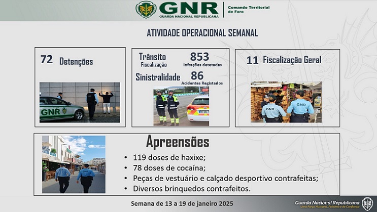 O Comando Territorial de Faro da Guarda Nacional Republicana levou a efeito um conjunto de operações no distrito de Faro, na semana de 13 a 19 de janeiro, que visaram a prevenção e o combate à criminalidade violenta, fiscalização rodoviária, entre outras, registando os seguintes dados operacionais: