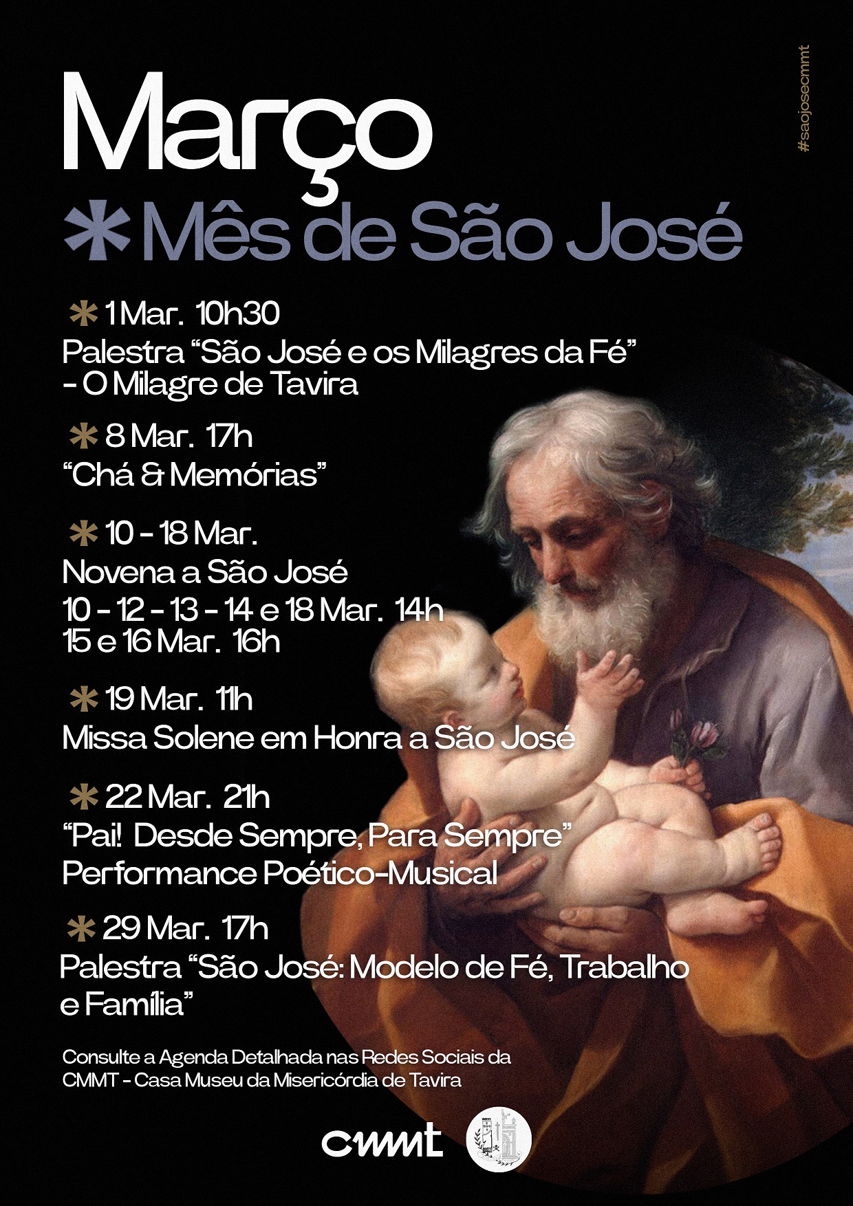 A Santa Casa da Misericórdia de Tavira, com o apoio do Colégio Santiago Internacional, do Município de Tavira e das Freguesias de Tavira, promove durante o mês de março um conjunto de atividades em honra de São José. A iniciativa visa celebrar a devoção a este santo, destacando o seu papel na fé, na família e no trabalho, através de palestras, encontros de memória, momentos de oração e eventos culturais.