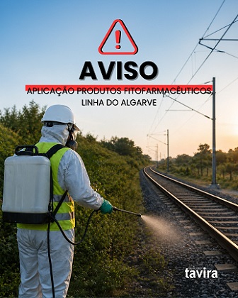 Informa-se que irão decorrer trabalhos de aplicação de produtos fitofarmacêuticos ao longo da via ferroviária da Linha do Algarve, entre os dias 27 de abril e 01 de maio, das 08h00 às 18h00, no âmbito de ações de controlo de vegetação promovidas pela Infraestruturas de Portugal.