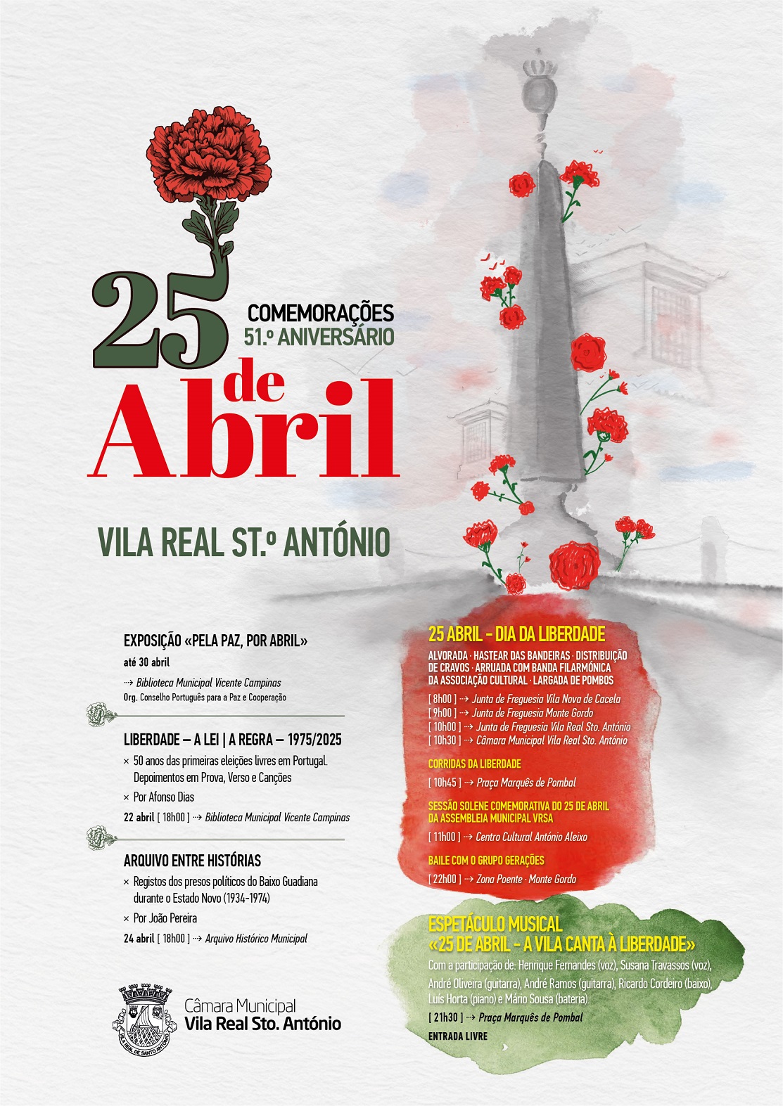 As comemorações do 25 de Abril são promovidas pela Câmara Municipal de Vila Real de Santo António e pretendem envolver toda a comunidade, num ambiente de festa, reflexão e afirmação dos valores de Abril.