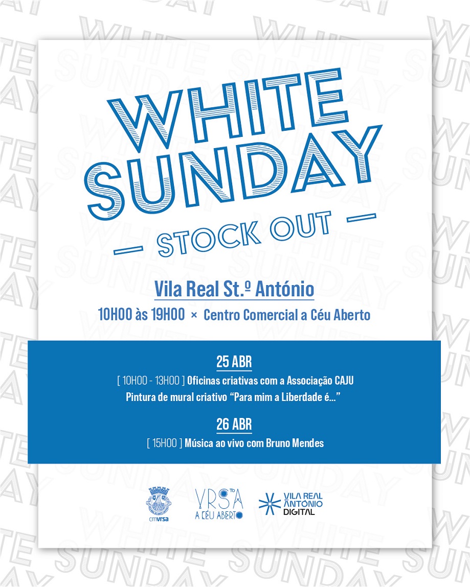 O White Sunday Stock Out regressa nos dias 25 e 26 de abril, entre as 10h00 e as 19h00, para animar o centro histórico de Vila Real de Santo António com promoções, animações de rua na zona do Centro Comercial a Céu Aberto e um mercadinho a realizar-se na Praça Marquês de Pombal.