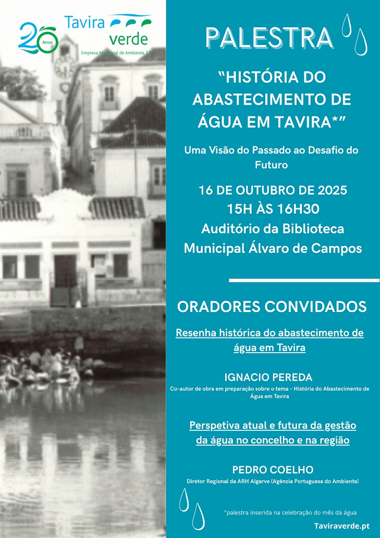 Em Tavira, no dia 16 de outubro, pelas 15 horas, o Auditório da Biblioteca Municipal Álvaro de Campos recebe a palestra “História do Abastecimento de Água em Tavira”.