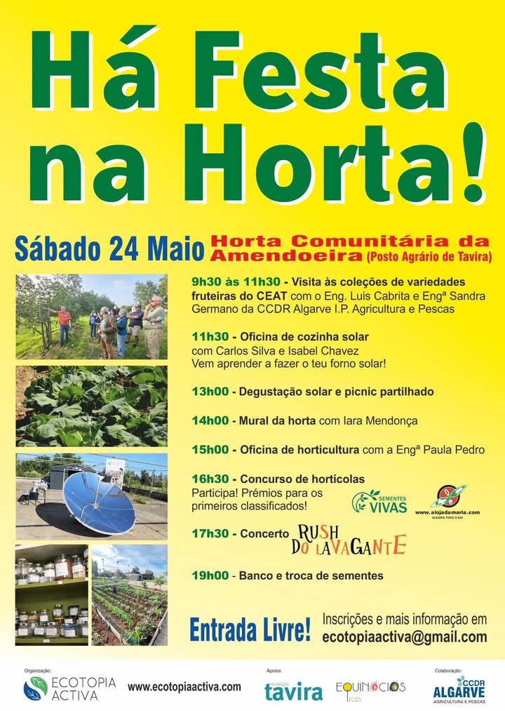 Desde 2022 Tavira tem hortas comunitárias. É fundamental nutrir a atenção para a temática da sustentabilidade dos sistemas alimentares, e o cultivo de alimentos apresenta-se como uma ferramenta crucial que proporciona o contacto com a natureza e experiências saudáveis ao ar livre. A promoção de uma cidade viva com hortas comunitárias e alimentação saudável que promove hábitos de alimentação e “estilo de vida saudáveis”, fomentando a “saúde mental” e o “slow living”, compagina Tavira com os “objetivos de Desenvolvimento Sustentável” e os princípios da “Dieta Mediterrânica”. Para continuar a fomentar estes valores junto da população a Ecotopia Activa, associação que tem a sua génese no Movimento de Cidadãos pelo CEAT e Hortas Urbanas de Tavira, promove uma “festa” nas hortas comunitárias e facilita uma oportunidade para que toda a comunidade de Tavira, e não só, possa conhecer e visitar o espaço, procurando envolver e aproximar todos, miúdos e graúdos, num dia repleto de acividades como p.e.: um concurso de hortícolas com prémios (“Sementes Vivas” e “A loja da Maria”) para os vencedores, que é sujeito a inscrição, tem regulamento e será decidido por jurados entendidos na matéria; uma oficina de cozinha solar dinamizada por Carlos Silva e Isabel Chavez onde se aprenderá a fazer fornos solares com materiais acessíveis; uma oficina de horticultura natural com a Engª Paula Pedro onde aprendemos, entre outras coisas, a fazer biopreparados; um concerto musical com a banda local Rush do Lavagante; a criação de um banco de sementes e espaço para um momento de troca de sementes; a elaboração do mural da horta durante a tarde; um convívio gastronómico com degustação de pratos elaborados com produtos frescos diretamente das hortas para os fornos solares e partilha de picnic comunitário; a exposição de alporques de cravos alusivos ao 25 de Abril de 1974 que poderão ser adquiridos por donativo; e, será ainda levada a cabo uma visita especial às coleções de variedades fruteiras do Centro de Experimentação Agrária de Tavira (CEAT) que será guiada pelos engenheiros agrónomos da CCDR Algarve I.P. Agricultura e Pescas.