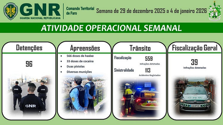 O Comando Territorial de Faro da Guarda Nacional Republicana levou a efeito um conjunto de operações no distrito de Faro, na semana de 29 de dezembro a 4 de janeiro, que visaram a prevenção e o combate à criminalidade violenta,