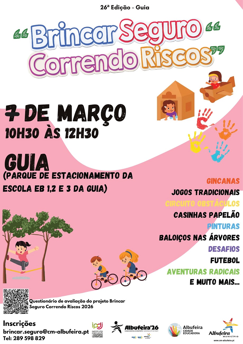 A Câmara Municipal de Albufeira realiza, no próximo dia 7 de março, mais uma edição do projeto “Brincar Seguro Correndo Riscos”. A iniciativa decorre entre as 10h30 e as 12h30, no parque de estacionamento da Escola Básica 1,2 e 3 da Guia, e destina-se a todas as crianças do concelho e às respetivas famílias.