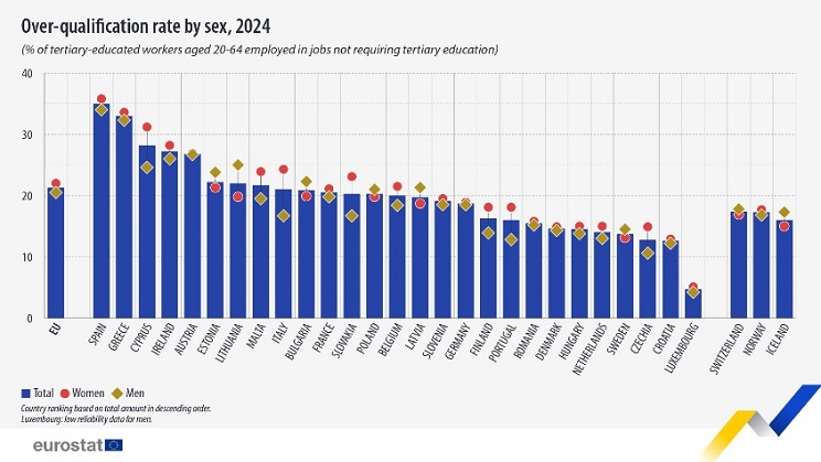 Entre os países da União Europeia, a taxa de sobrequalificação foi mais alta em Espanha (35,0%), seguindo-se a Grécia (33,0%) e o Chipre (28,2%)”.