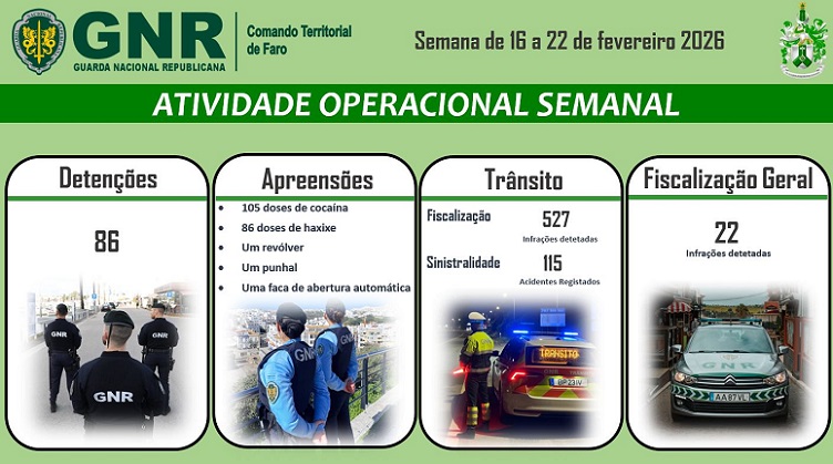 O Comando Territorial de Faro da Guarda Nacional Republicana, através do Subdestacamento Territorial de Albufeira, no dia 20 de março de 2026, deteve um homem de 41 anos e uma mulher de 40 anos, por furto em estabelecimento, no concelho de Albufeira.