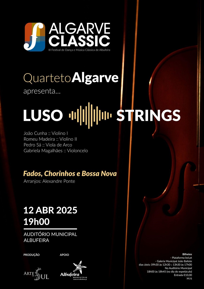 No próximo dia 12 de abril (sábado), o III Festival de Dança e Música Clássica de Albufeira – Algarve Classic apresenta o espetáculo “Luso Strings”, às 19h00, no Auditório Municipal de Albufeira.