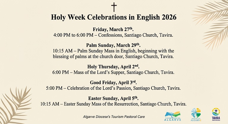 A Paróquia de Tavira e o Setor da Pastoral do Turismo da Diocese do Algarve acabam de anunciar, pelo segundo ano consecutivo, um programa de celebrações da Semana Santa totalmente em língua inglesa, a decorrer na emblemática Igreja de Santiago.
