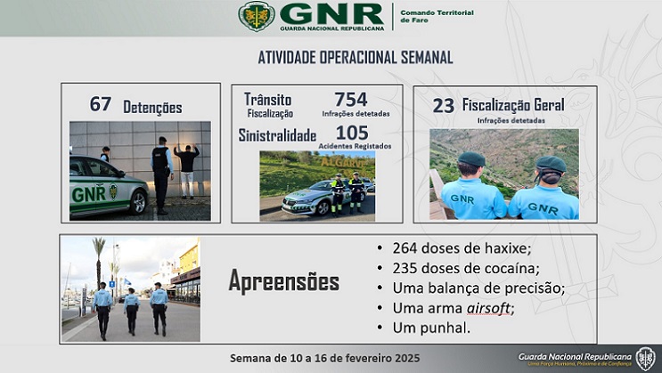 O Comando Territorial de Faro da Guarda Nacional Republicana levou a efeito um conjunto de operações no distrito de Faro, na semana de 10 a 16 de fevereiro, que visaram a prevenção e o combate à criminalidade violenta, fiscalização rodoviária, entre outras, registando os seguintes dados operacionais: