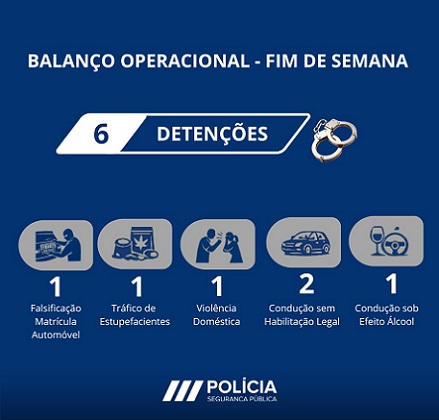 No fim de semana de 17 a 19 de abril, o Comando Distrital da PSP de Faro registou seis detenções por diversos ilícitos, nomeadamente, falsificação de matrícula automóvel, tráfico de estupefacientes, violência doméstica, condução sem habilitação legal e condução sob o efeito de álcool.