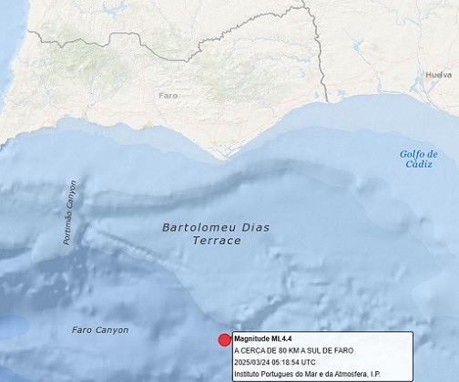 Em comunicado, o IPMA adianta que o sismo teve o seu epicentro a cerca de 75 quilómetros a sul de Faro e foi registado pelas 05:18 nas estações da Rede Sísmica do Continente.