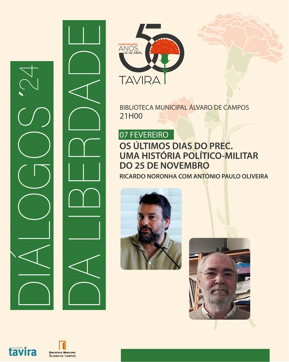 No dia 07 de fevereiro regressa à Biblioteca Municipal Álvaro de Campos, em Tavira, mais um ciclo dos “Diálogos da Liberdade”. A primeira sessão “Os últimos dias do PREC. Uma história político-militar do 25 de Novembro”, sob a orientação de Ricardo Noronha com António Paulo Oliveira, terá lugar, pelas 21h00.