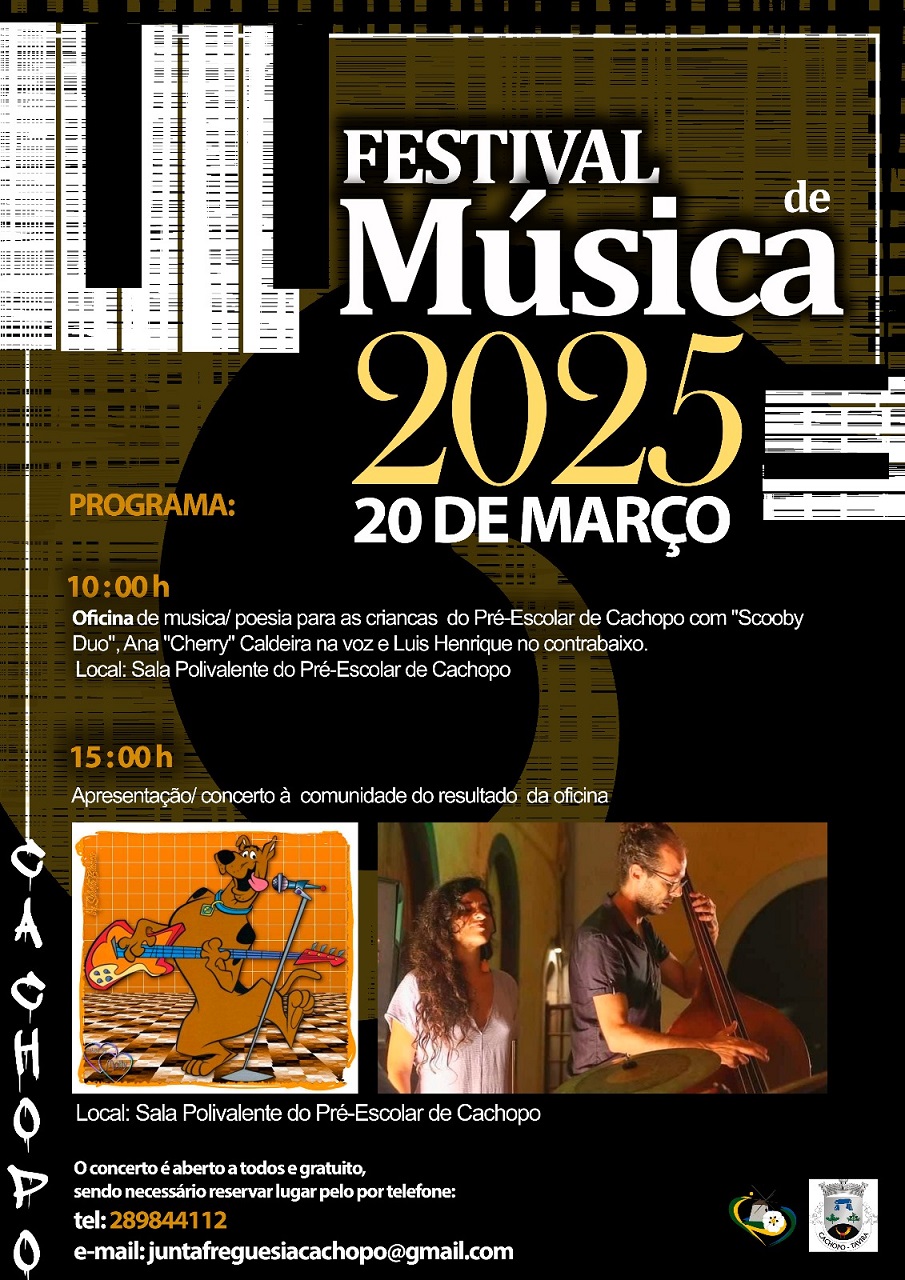 O Festival de Música de Cachopo 2025 terá início no próximo dia 20 de março com uma oficina de música/poesia para as crianças do Pré-Escolar com "Scooby Duo" com Ana "Cherry" Caldeira na voz e Luís Henrique no contrabaixo.