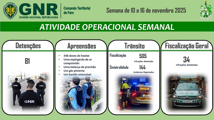 O Comando Territorial de Faro da Guarda Nacional Republicana levou a efeito um conjunto de operações no distrito de Faro, na semana de 10 a 16 de novembro, que visaram a prevenção e o combate à criminalidade violenta, fiscaliza