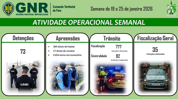 O Comando Territorial de Faro da Guarda Nacional Republicana levou a efeito um conjunto de operações no distrito de Faro, na semana de 19 a 25 de janeiro, que visaram a prevenção e o combate à criminalidade violenta, fiscalizaç